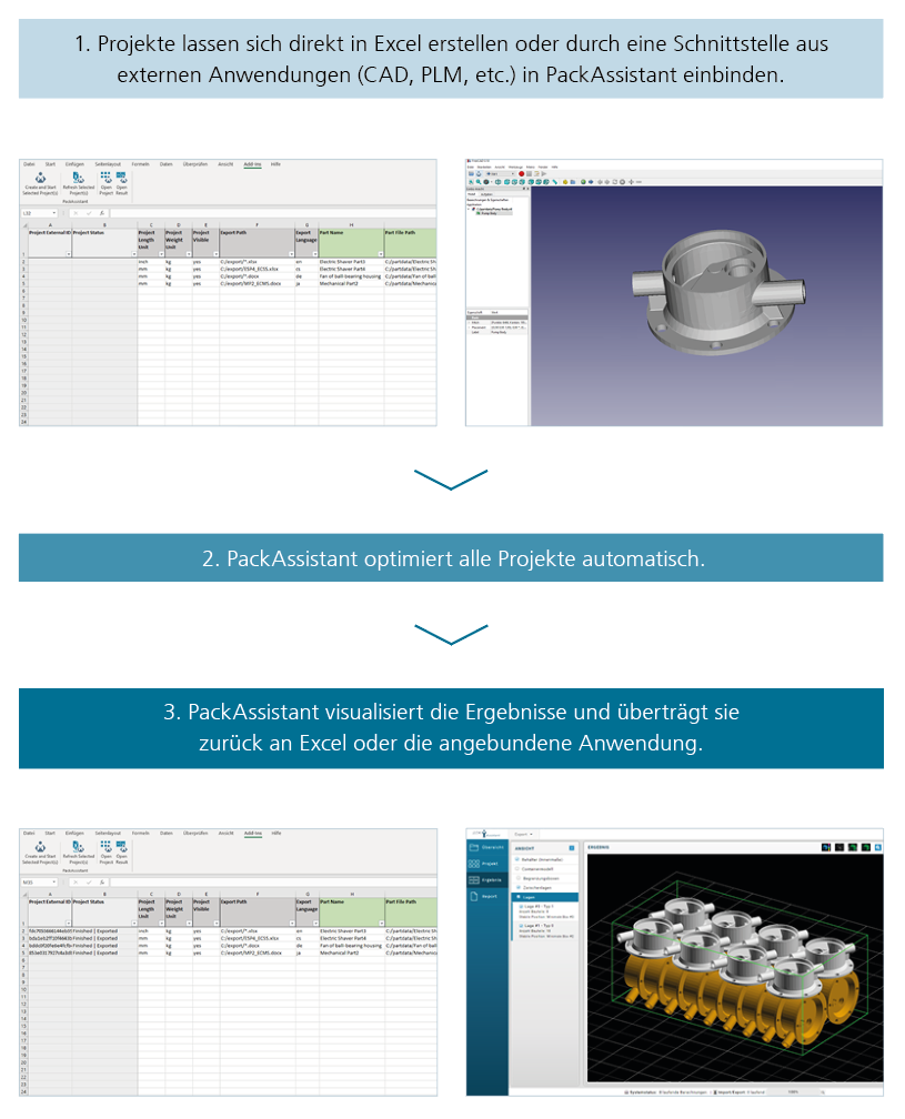 PackAssistant erlaubt es Anwendern, Behälterbefüllungen mit verschiedenen Packungsarten zu berechnen, die in den folgenden Abschnitten erklärt werden. Zusätzlich bietet die Software weitere Funktionen für kundenspezifische Verpackungslösungen an: