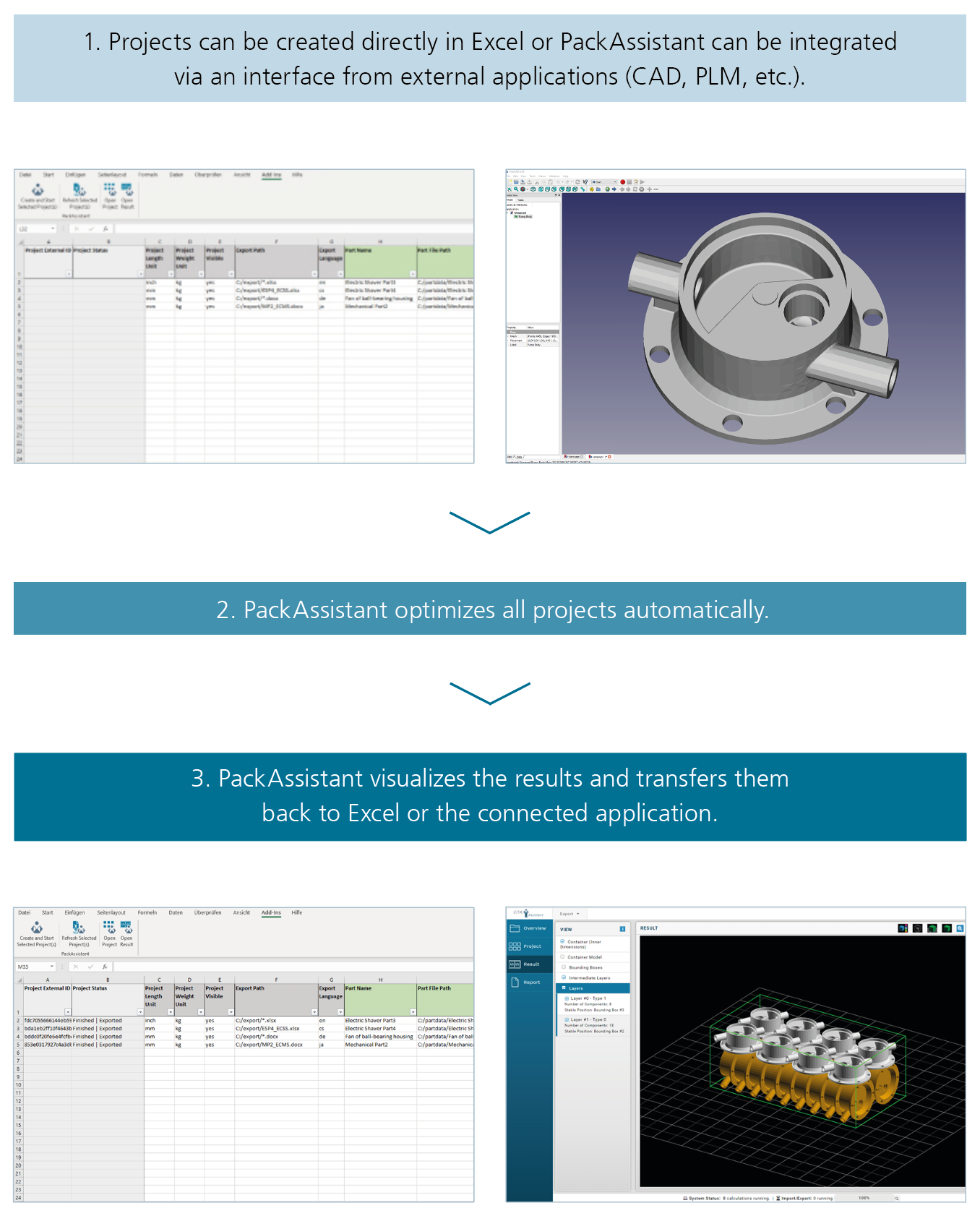 PackAssistant supports a wide range of packaging types, described in the sections below. It also offers advanced functions for customer-specific solutions, including: